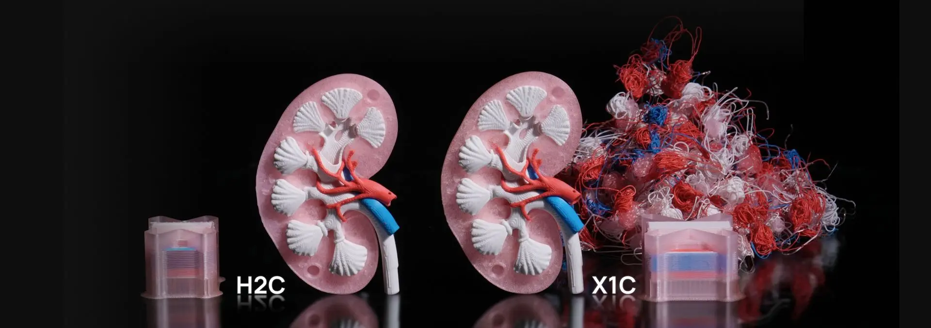 Im Gegensatz zu herkömmlichen Druckern mit Werkzeugwechsler, bei denen die Anzahl der Farben durch die Anzahl der Werkzeugköpfe begrenzt ist, unterstützt der H2C durch parallel geschaltete AMS-Einheiten bis zu 24 Materialien in einem einzigen Druckvorgang. Sein intelligenter Algorithmus optimiert die Zuweisung von Filament zu Hotend, um den Ausschuss zu minimieren und gleichzeitig hervorragende Ergebnisse bei Mehrfarben- und Mehrmaterialdrucken zu erzielen.