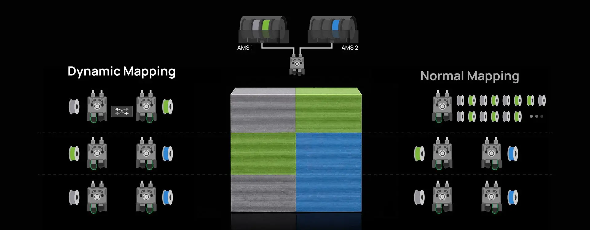 Der Filament-Weichenmechanismus entkoppelt das AMS von bestimmten Düsen, sodass jedes Filament unabhängig von der Konfiguration in jede Düse eingezogen werden kann. Dies ermöglicht eine dynamische Filamentzuordnung, wodurch Farbwechsel während des Druckvorgangs möglich werden, was die Effizienz beim Mehrfarbendruck erheblich steigert.
