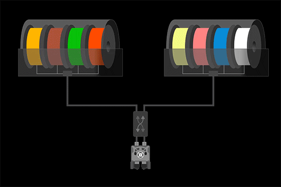 3D-Drucker mit Dual-Extrusion beschleunigen den Mehrfarbendruck erheblich, indem sie die bei Maschinen mit Einzelextrusion erforderliche Spülzeit reduzieren. Bislang mussten die Spulen manuell zwischen den AMS-Einheiten ausgetauscht werden, um sicherzustellen, dass die Filamente die richtige Düse erreichten. Mit dem Filament Track Switch gehören diese Zeiten der Vergangenheit an. Er leitet jedes Filament von Ihren AMS-Einheiten intelligent zu der Düse, die der Slicer zuweist, und bietet Ihnen so absolute Hardware-Flexibilität und schnellere Druckergebnisse.