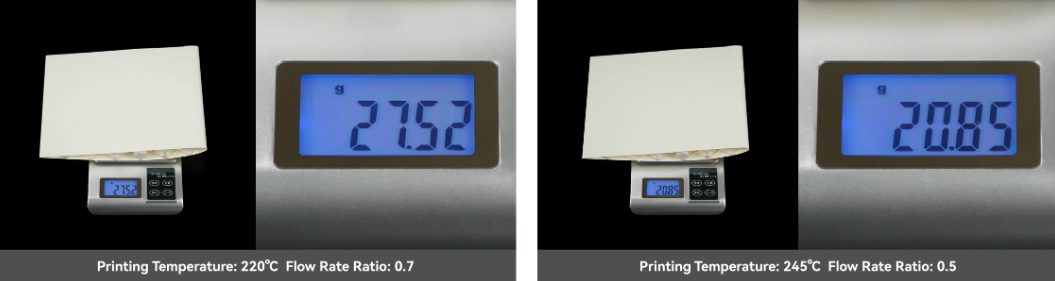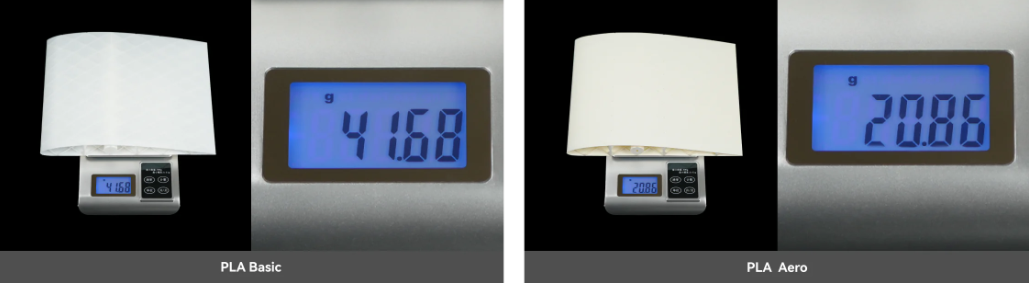 * Beim Drucken von Modellen mit demselben Volumen ist PLA Aero etwa halb so schwer wie PLA Basic.