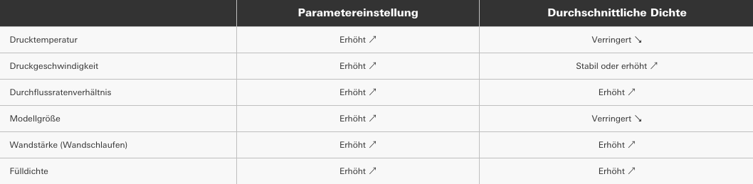 Erzielen Sie eine geringere Dichte der Drucke, indem Sie die Drucktemperatur erhöhen und die Durchflussrate verringern.