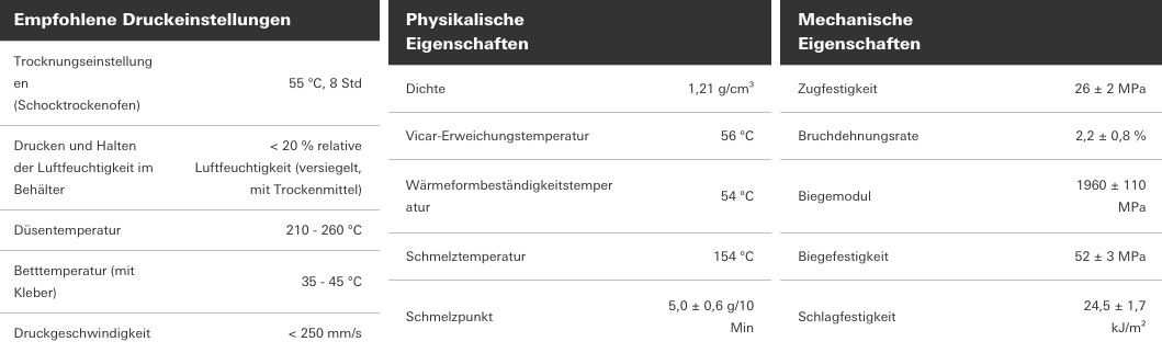 PLA Aero neigt zu stringing und oozing, wenn es nass wird. Die empfohlene Trocknungsbedingung beträgt 8 Stunden lang 55 °C in einem Lufttrockenofen und 12 Stunden lang 75 °C auf dem Heizbett des Druckers.