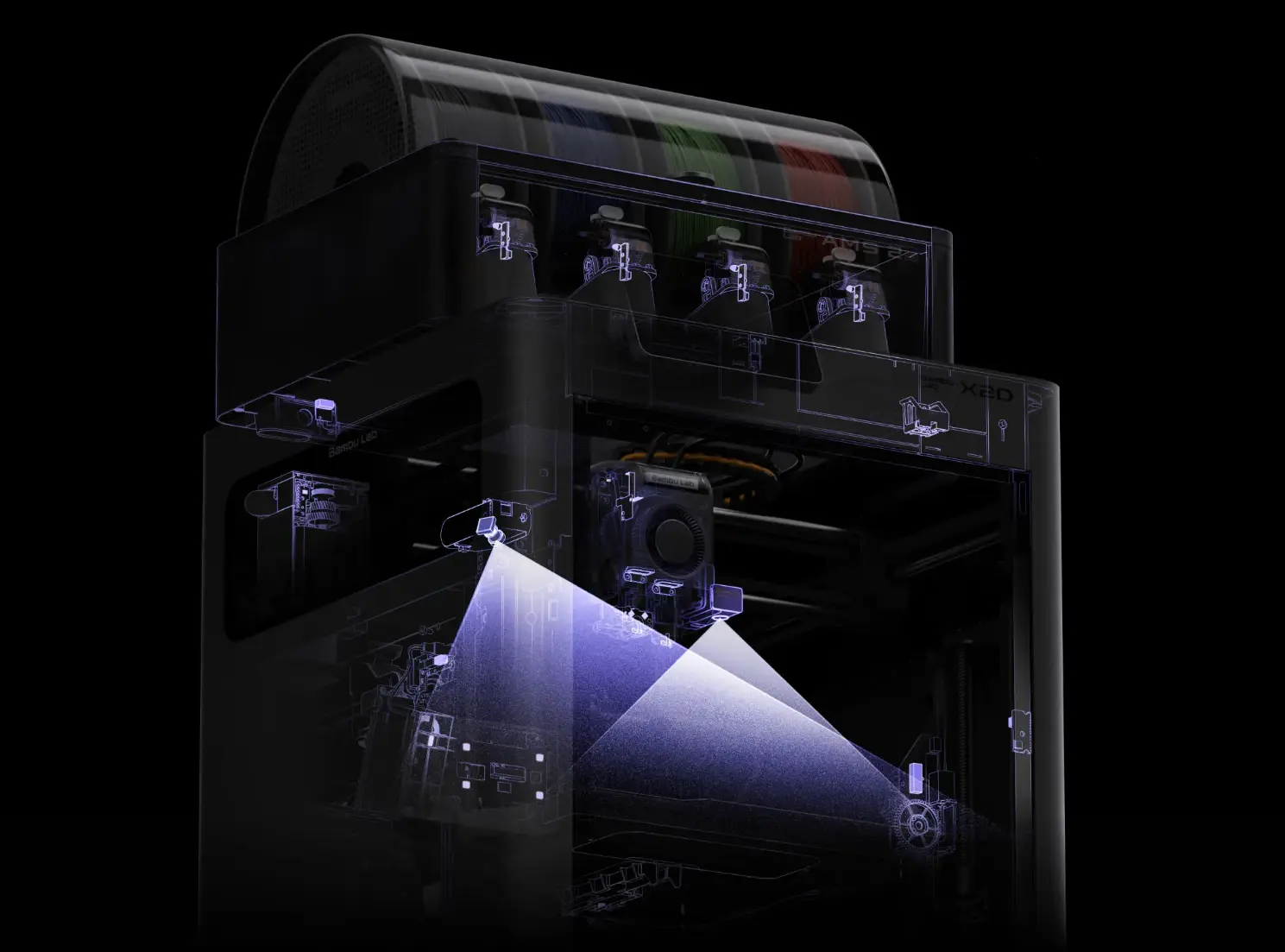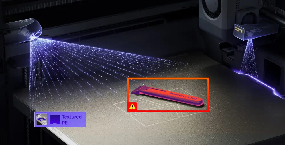 Zusätzlich überwacht ein KI-gestütztes System den gesamten Druckprozess. Es erkennt Rückstände auf der Bauplatte vor dem Start und identifiziert während des Drucks typische Fehler wie „Spaghetti” oder Verstopfungen. Ein umfassendes Sensorsystem unterstützt dies, indem es alle relevanten Bereiche der Maschine kontinuierlich überwacht.