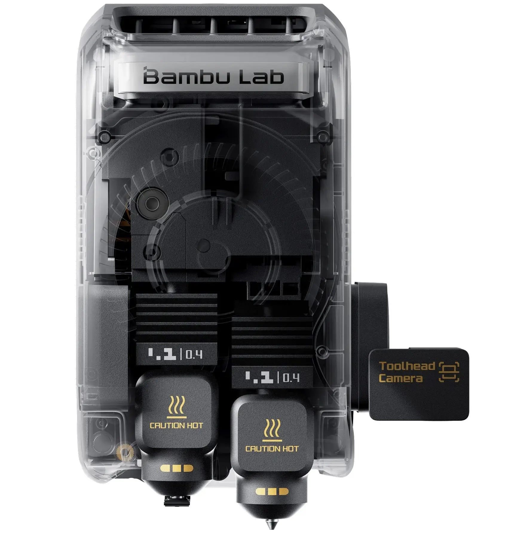 Der X2D übernimmt das charakteristische industrielle Designs und zeichnet sich durch einen Vollmetallrahmen für strukturelle Stabilität aus. Der Druckkopf ist das Design-Highlight dieser Generation. Die Doppeldüse verfügt über einen rein mechanischen Umschaltmechanismus, der den Druckkopf leicht hält und gleichzeitig die Funktionalität verbessert.