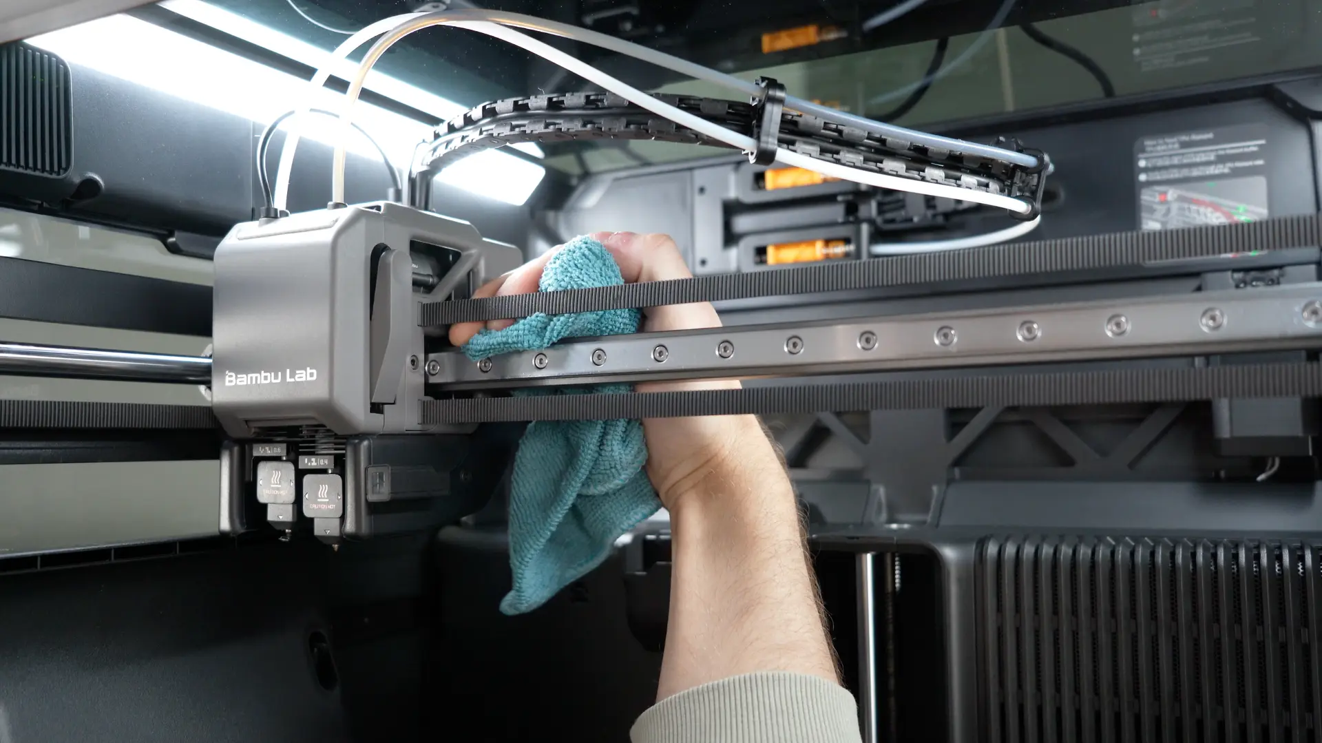 Die Lüfter sollten frei drehbar sein, sauber sein und keine ungewöhnlichen Geräusche verursachen. Zusätzlich empfiehlt sich eine Sichtprüfung der Bewegungsachsen, Riemen und Linearschienen, damit diese leichtgängig laufen und keine Verschmutzungen aufweisen. Bei Druckern mit automatischen Materialsystemen wieder AMS sollte die Filamentzuführung inklusive Sensorik getestet werden, um einen reibungslosen Materialwechsel zu gewährleisten.