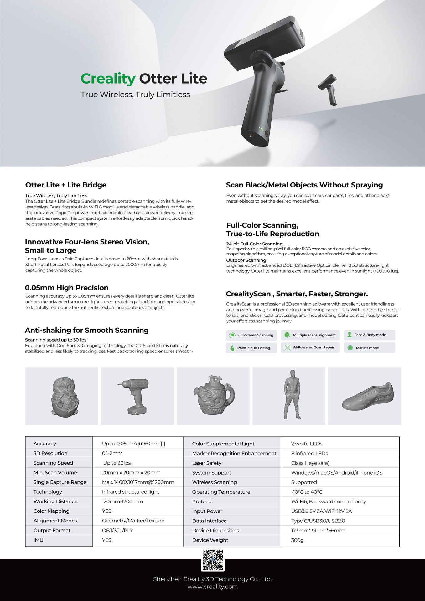 Der Creality CR-Scan Otter Lite ist der neueste 3D-Scanner von Creality, der sich durch hohe Präzision, Benutzerfreundlichkeit und ein attraktives Preis-Leistungs-Verhältnis auszeichnet. Mit einer Genauigkeit von bis zu 0,02 mm und der Möglichkeit, sowohl große als auch kleine Objekte detailreich zu erfassen, richtet sich dieser Scanner an kreative Anwender, Hobbyisten, Designer und Profis gleichermaßen.