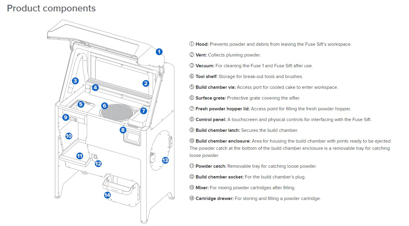 Das Freilegen der Bauteile aus dem Pulverbett kann grundsätzlich eine "staubige" Angelegenheit sein. Um zu vermeiden, dass Pulver in ihre Arbeitsräume entweicht wird in der Fuse Sift mithilfe eines Industrie-Saugers ein "externes Vakuum" erzeugt. Eine durchsichtige Haube schützt den Benutzer zusätzlich nach oben. Das eingesaugte Pulver wird von einem HEPA-Filter zur späteren Entsorgung aufgenommen.Zum Betrieb der Fuse Sift ist ein Industrie-Sauger erforderlich, der spezielle Sicherheitsanforderungen erfüllen muss. Er wird direkt an die Fuse Sift angeschlossen und von ihr gesteuert.