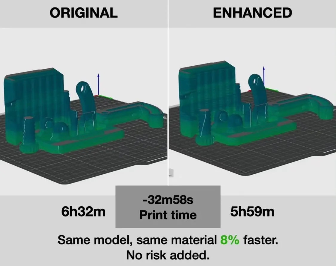 Eine Temperatur-Heatmap auf Bauteilebene zeigt wärmere und kühlere Bereiche an. Sie verdeutlicht, wie sich Geometrie, Schichtzeit und Kühlbedingungen beeinflussen und, wo sich thermische Risiken ansammeln. Die Optimierungsfunktion passt automatisch die Schichtzeiten (durch sichere Geschwindigkeitsänderungen) an. So wird die Haftung verbessert, Warping reduziert und oft auch die Druckzeit verkürzen. Die Optimierung zielt auf Festigkeit und geringeres Verziehen ab,