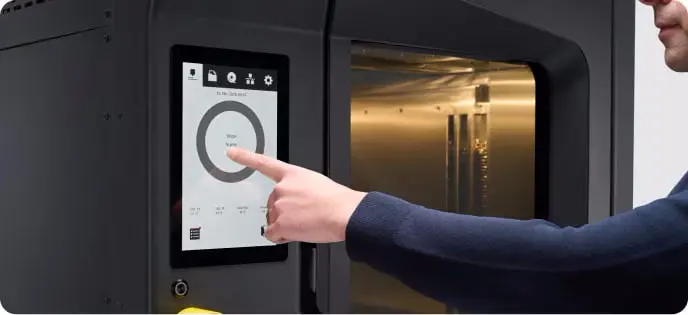 Sorgen Sie für Prozessstabilität und Zuverlässigkeit durch präzise Druckerüberwachung über die integrierte Farb-Touchscreen-Oberfläche. Navigieren Sie mühelos durch übersichtliche, benutzerfreundliche Menüs, um den HP IF 3D-Drucker 600 HT zu steuern und den Betriebsstatus in Echtzeit zu überwachen.