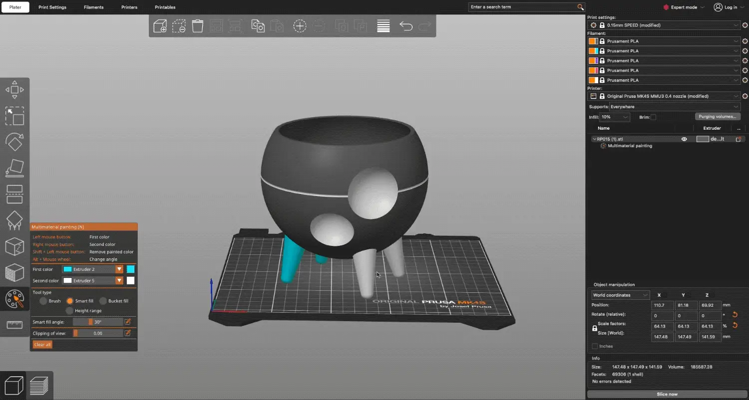 Wir bieten mehrere Möglichkeiten, Filament zu sparen und Kunststoffabfälle weiter zu reduzieren. PrusaSlicer bietet Optionen wie Wipe-to-Infill, bei dem das Infill des gedruckten Objekts anstelle eines Reinigungsturms verwendet wird, oder Wipe-to-Object, bei dem ein anderes Objekt als Reinigungsturm dient. Letzteres führt zu einem sehr farbenfrohen Druck. Wenn Sie also ein funktionales Teil benötigen oder es später lackieren möchten, ist dies eine hervorragende Möglichkeit, den Kunststoffabfall zu minimieren.