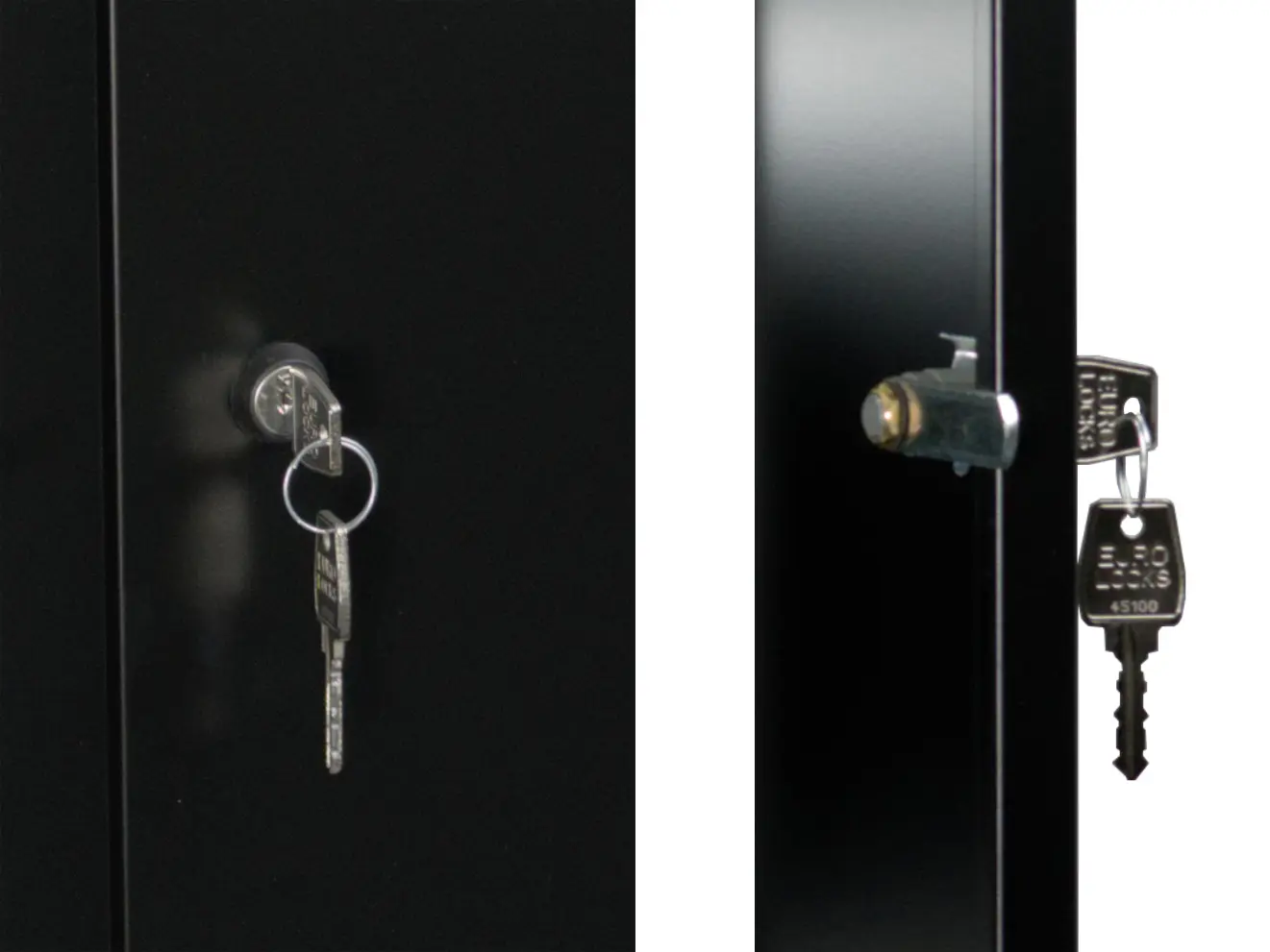 Zum Lieferumfang gehören zwei passende Schlüssel. So können Sie bequem einen Ersatzschlüssel verwahren oder mehreren Personen einen kontrollierten Zugriff auf den Schrank ermöglichen.